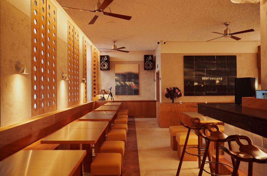 This listening bar meets cantina, equipped with a beautiful private bar, DJ booth, vintage speakers, a vinyl wall, and plenty of art. It's a place designed primarily for enjoying a drink and a bite to eat together. The space is perfect for a boardroom meeting, brainstorming session, reception, birthday party, after-work drinks, lecture, or even a wedding. Cheers!