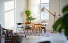The warehouse can be used in many ways. Beautiful, light linen curtains divide the space. Curtains also cover the characteristic large windows. Together with the plants, they create a homey and warm feel. Industrial yet warm at the same time!