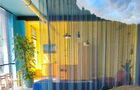 Behind the in-between curtains is the long wooden table and the plug&play 65-inch screen with videoconferencing function and clear sound.