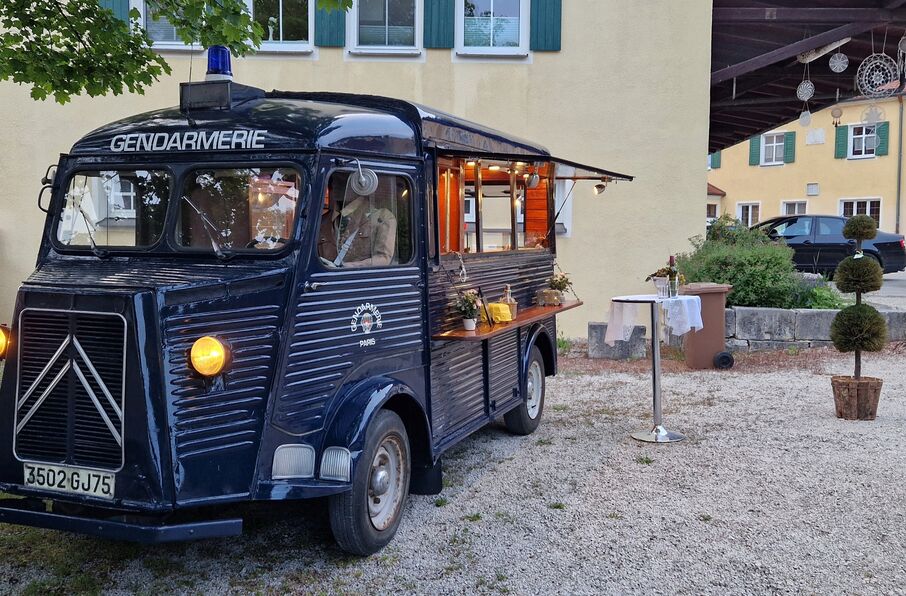 Our lovingly converted Citroën Type H in charming Gendarmerie retro style is the ideal sales or distribution stand.