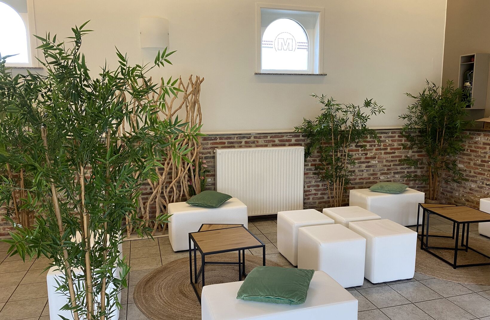 White and green. Green and white. Some lounge, some standing tables, some classic seating.