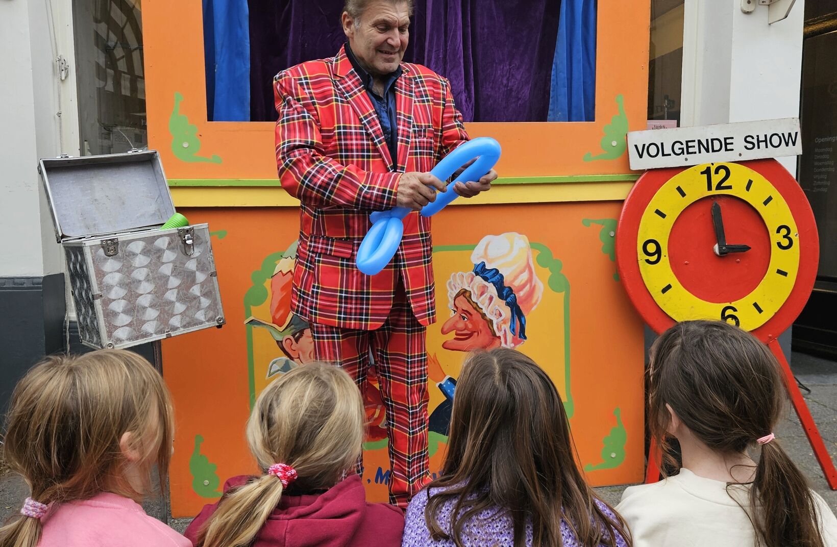 In between the theatre performances, the puppeteer folds all kinds of balloons.