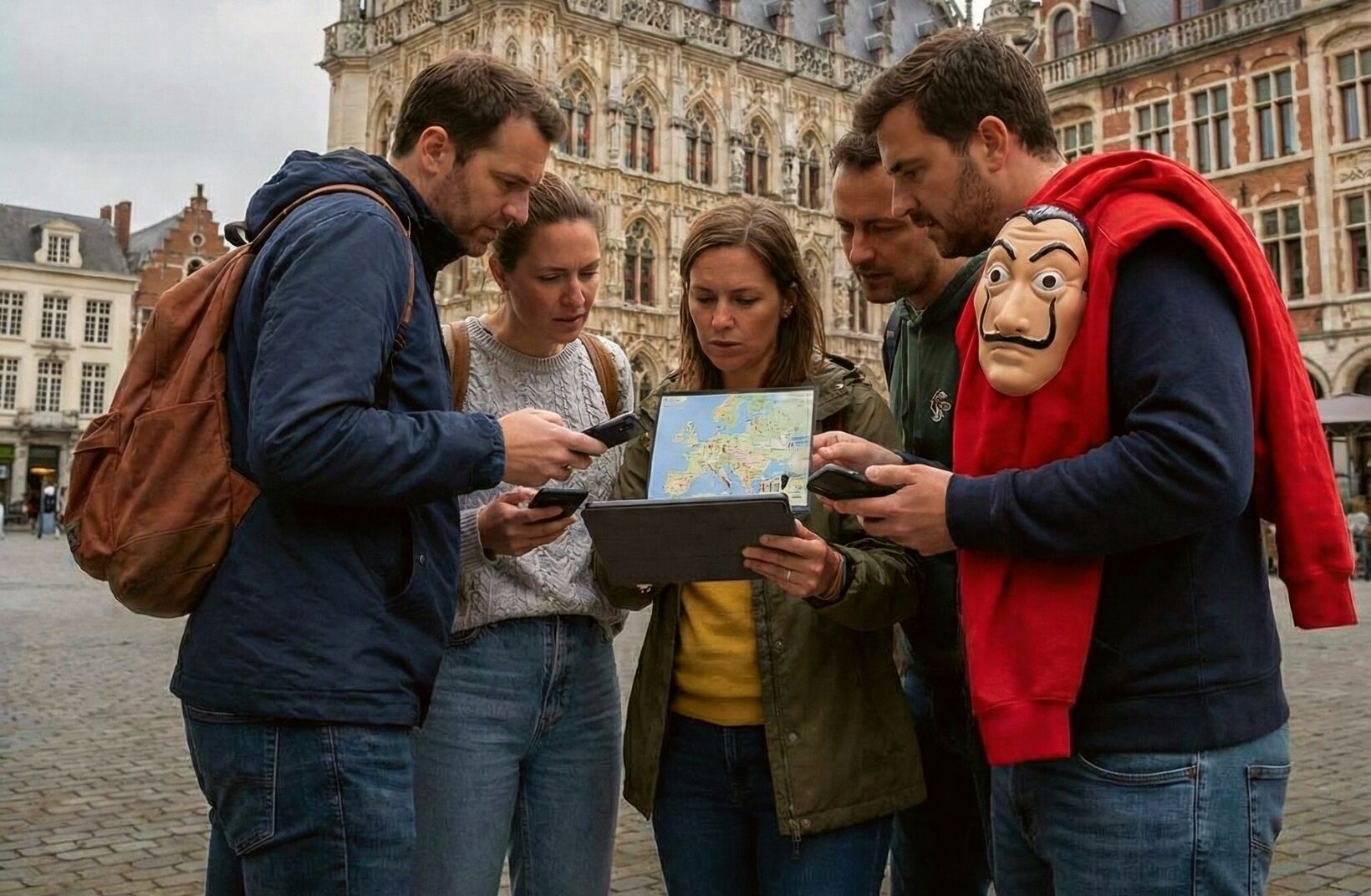 Kijk naar de focus van dit team voor het iconische stadhuis van Leuven. Ze zijn niet zomaar toeristen; ze zijn op een missie. Bij deze interactieve teambuilding van Geoteam wordt de stad omgetoverd tot één groot speelveld waar elke hoek een geheim verbergt.
