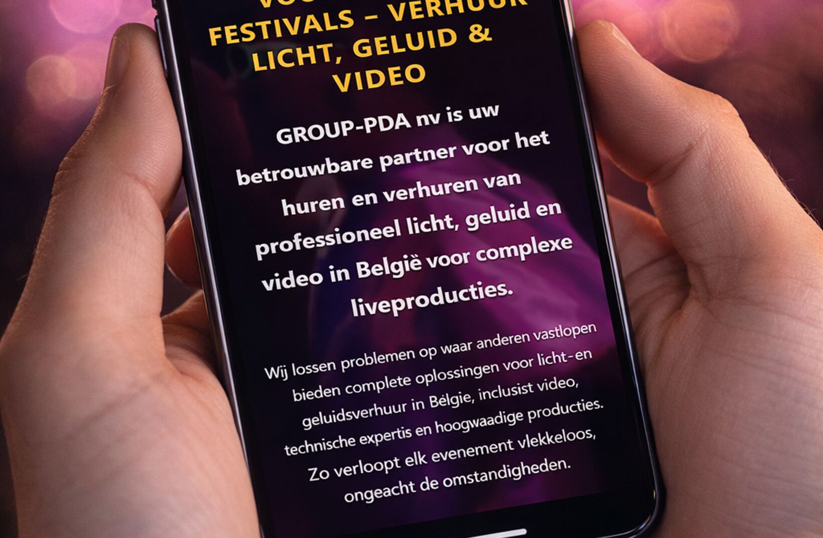 In de wereld van tours en festivals draait alles om de perfecte indruk. Dat geldt voor de producties die wij neerzetten, maar natuurlijk ook voor onze eigen presentatie. Met trots stellen wij u ons vernieuwde digitale visitekaartje voor: de nieuwe website van GROUP-PDA nv.