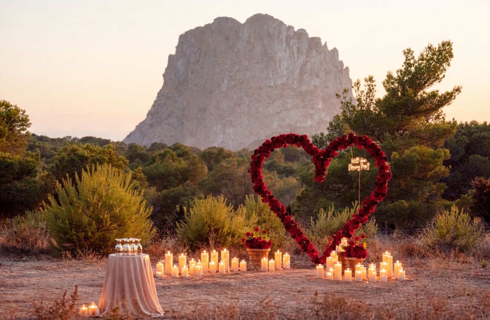 We offer a beautiful, large red rose heart in a unique, private location in a meadow opposite Es Vedrà… a place where peace, nature, and romance come together 🌿